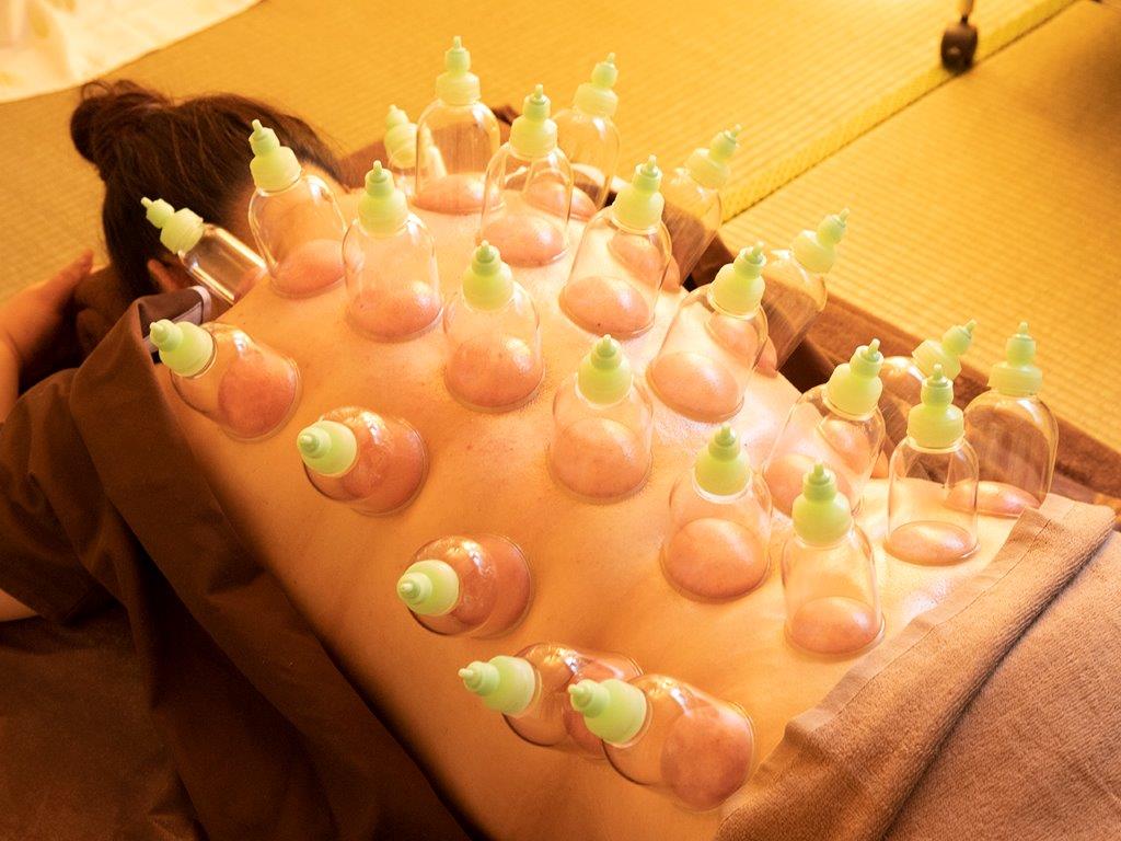 カッピング(吸い玉)とは、「引圧」で真空状態にしたカップを体に吸着して血流の流れを促進改善させる施術です。